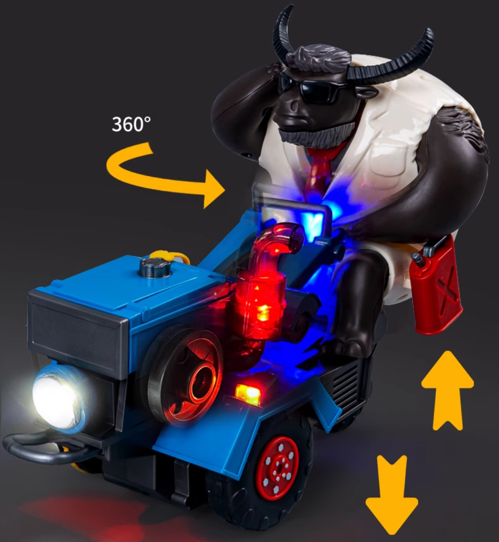 This electric tractor stunt bull cart toy has a unique shape. The cute bull driver is matched with a blue tractor body with a sense of technology and industrial style, red and black wheels and bright lights. Every detail shows creativity. Whether it is displayed in the living room or as a playmate for children, it is very eye-catching.